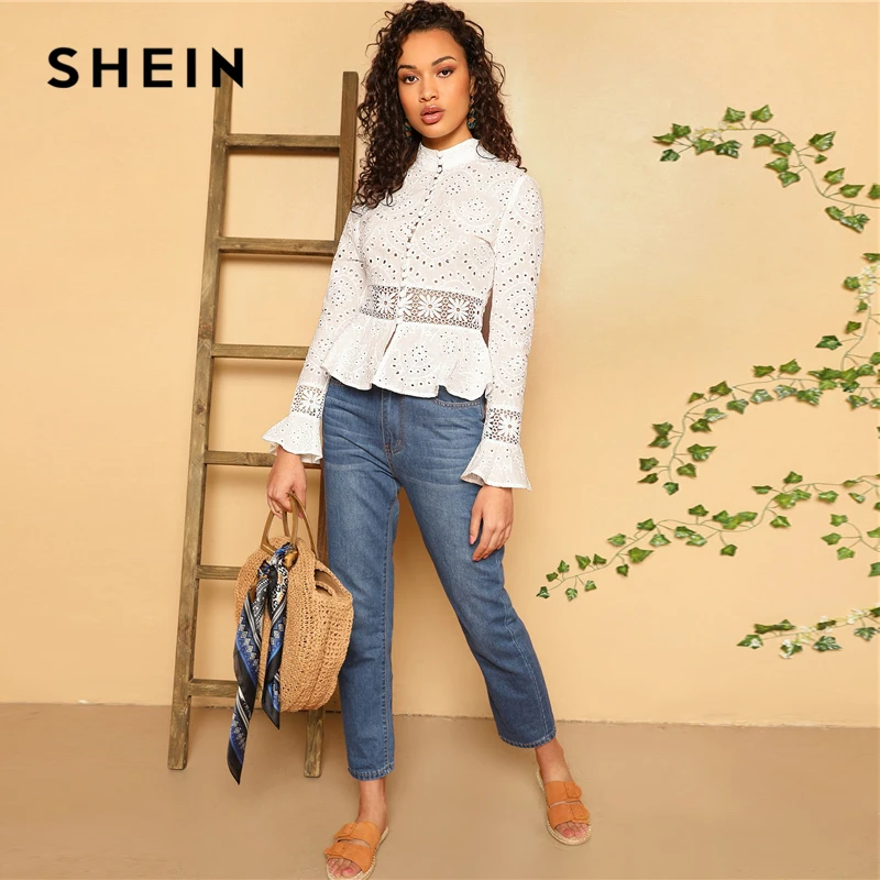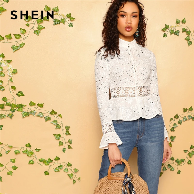 incredible SHEIN White Guipure Lace Insert Embroidered Eyelet Peplum Top Blouse Women Long Sleeve Slim Fit Off