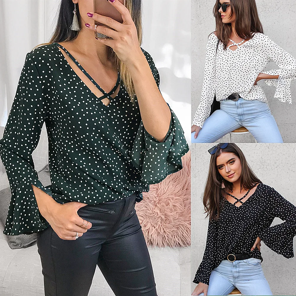 remarkable Casual Polka Dot White Womens Tops and Blouses 2019 Summer V-neck Flare Sleeve Chiffon Blouse Women